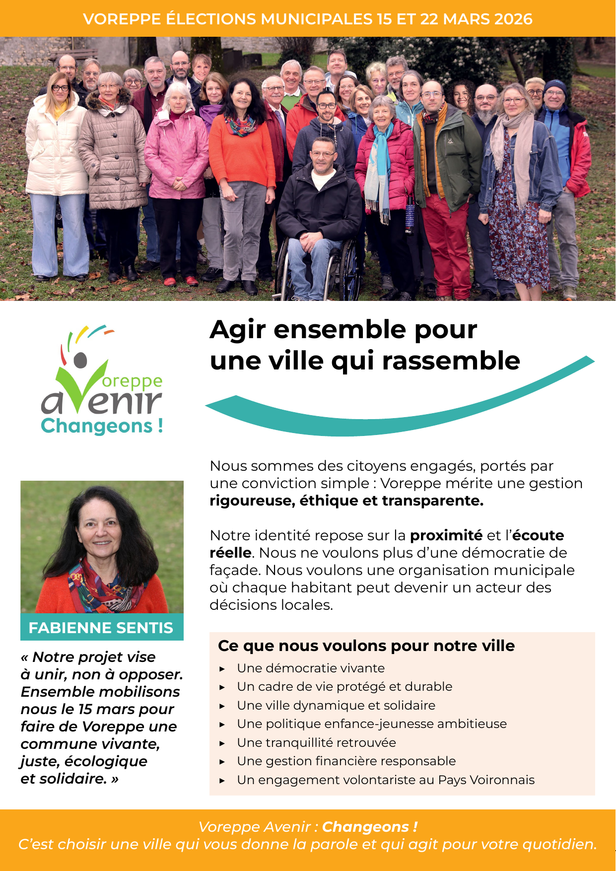 Lors des élections municipales, vous allez choisir non seulement la Maire, mais aussi l’équipe qui pendant 6 ans aura la responsabilité de vous accompagner au quotidien. Cette équipe devra anticiper les changements auxquels nous aurons tous à faire face pour que Voreppe soit une commune préservée encore plus agréable à vivre.