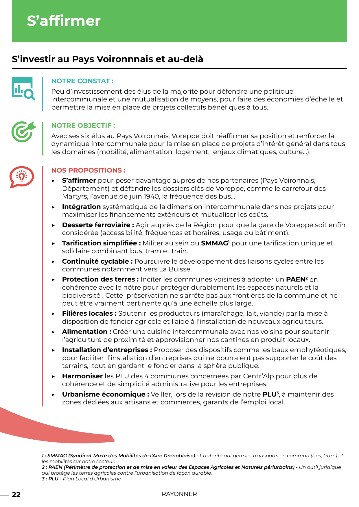 Notre Objectif : Avec ses six élus au Pays Voironnais, Voreppe doit réaffirmer sa position et renforcer la dynamique intercommunale pour la mise en place de projets d’intérêt général dans tous les domaines (mobilité, alimentation, logement, enjeux climatiques, culture…).